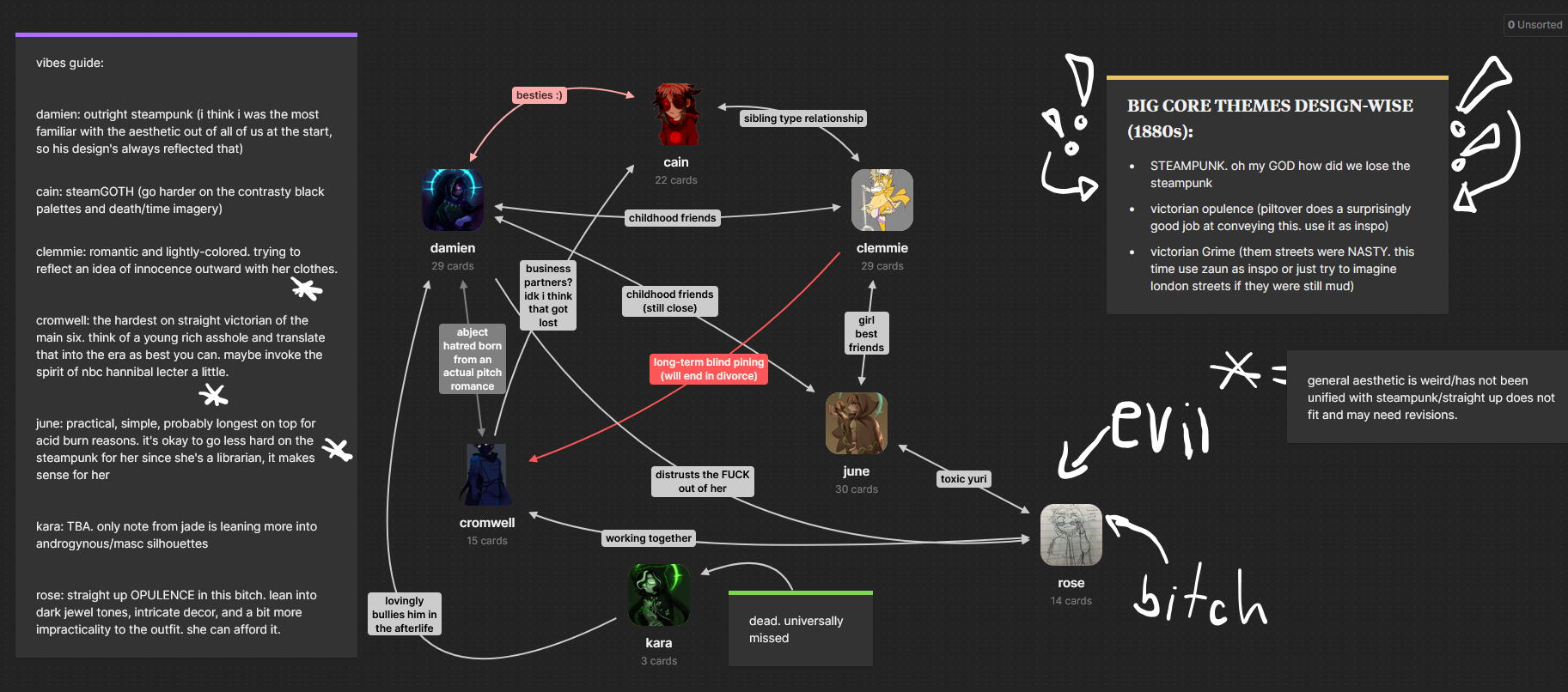 This is a screenshot of the official Milanote board. I made this, each character board is full of aesthetic and clothing references with my notes, it's just a reference for me that I keep around so Jade can also see it.